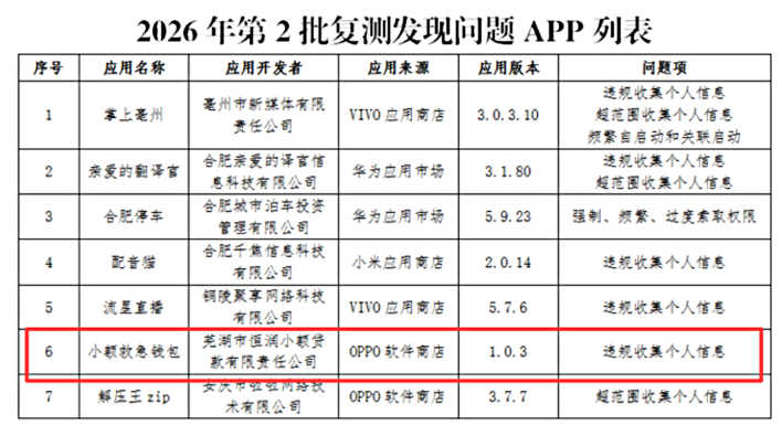 3月16日发布的《安徽省通信管理局关于侵害用户权益APP的通报(2026年第2批)》显示,安徽省通信管理局检测发现22款APP存在违法违规收集使用个人信息的问题,截至目前,尚有7款APP未完成问题整改,其中就包括芜湖市恒润小额贷款有限责任公司(下称“恒润小贷”)旗下的“小额救急钱包”,问题为“违规收集个人信息”。