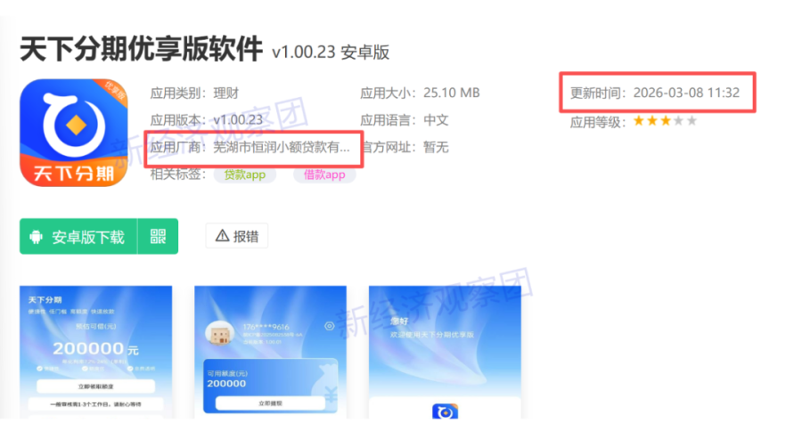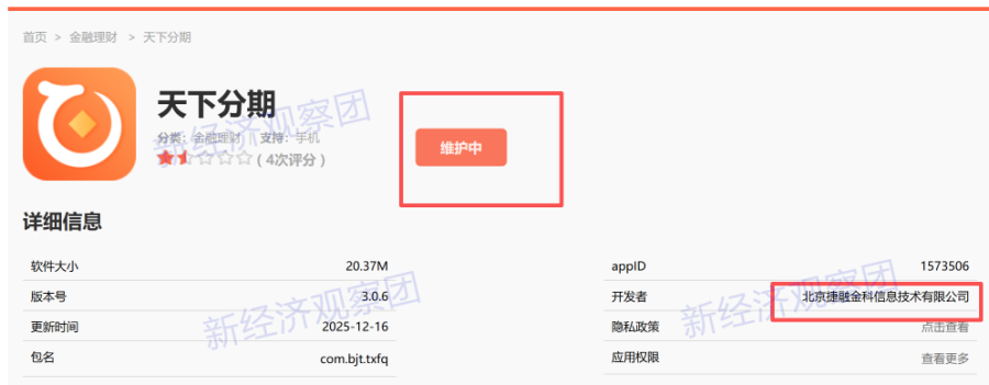 但笔者在应用商店查询发现,“天下分期优享版”的应用厂商确实为恒润小贷,更新时间为今年3月8日,logo变成了蓝色。而原先的橙色系“天下分期”APP显示“维护中”疑似下架。后者开发者为北京捷融金科信息技术有限公司,隐私政策显示由金华市安民融资担保有限公司、南京市天下捷融互联网科技小额贷款有限公司、北京捷融金科信息技术有限公司及存在关联关系的公司为用户提供融资咨询相关服务。