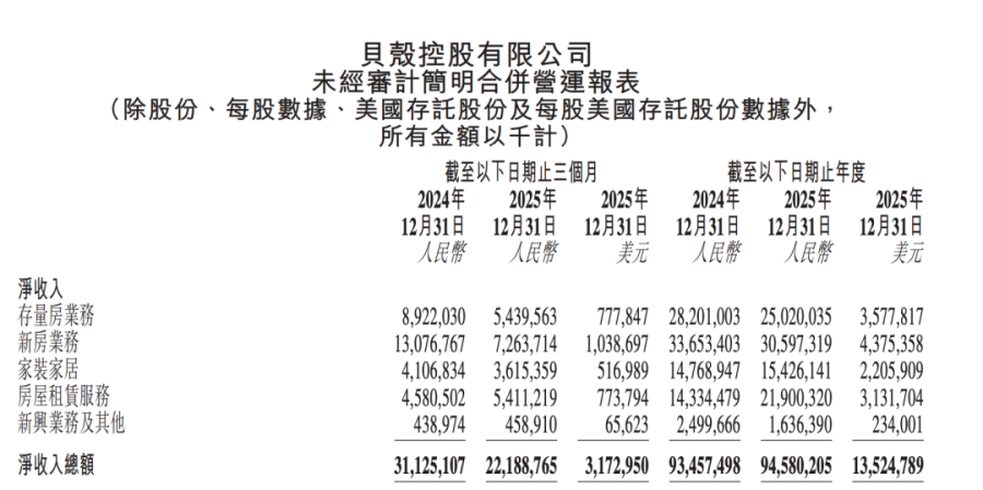 房地产行业还在结构调整中重塑,居住服务行业龙头贝壳也交出了2025年成绩单。