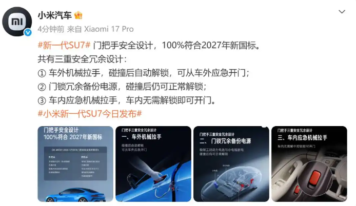 雷军也回应了大家最关心的门把手设计:我们新一代SU7的门把手,百分之百符合新国标。