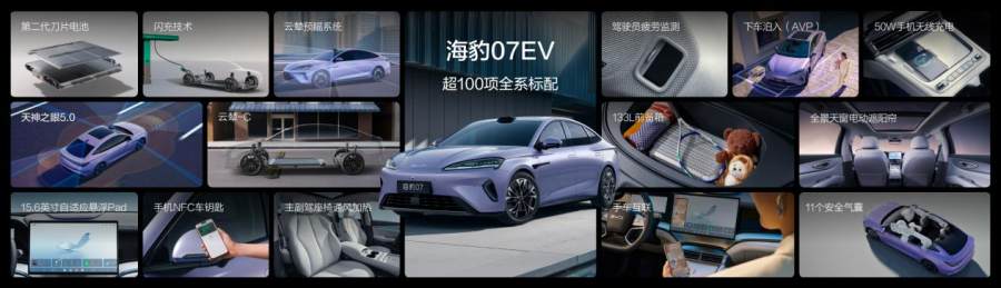 值得一提的是,海豹07EV还搭载天神之眼5.0,支持城市NOA,带来了更智能和更从容的辅助驾驶体验。作为海豹07家族新增车型,海豹07EV出手便是“王炸”,延续家族设计的同时,整车配置不俗,尤其是第二代刀片电池和闪充技术的加持下,带来了焕然一新的纯电用车体验。