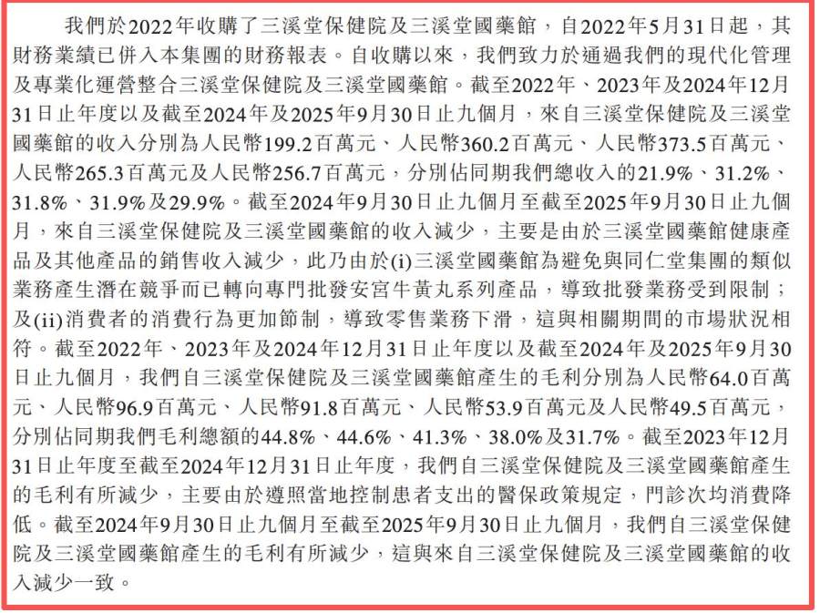 过去数年,同仁堂医养并购了多家机构,包括2022年收购的三溪堂保健院、三溪堂国药馆等。报告期内,来自这两家机构的收入分别约为1.99亿元、3.60亿元、3.74亿元和2.57亿元,占比分别为21.9%、31.2%、31.8%和29.9%。