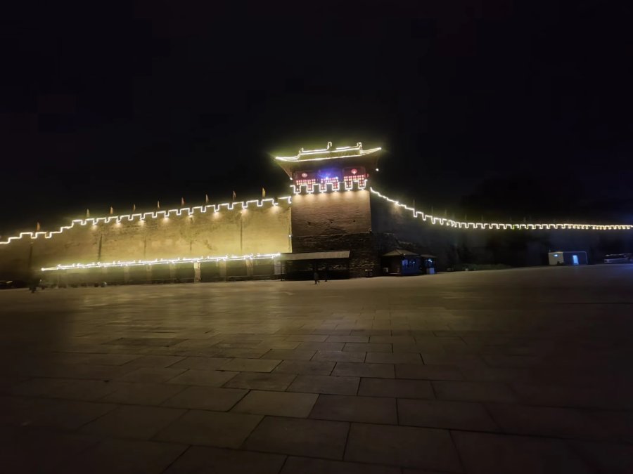 趁着夜色走出古城,回望那高大雄伟的城墙。城墙周长1400余米,高12米,底宽8米,顶宽3米,城墙上马面、敌楼、窝铺等防御设施一应俱全,宛如一位位忠诚的卫士,默默守护着这座古城。