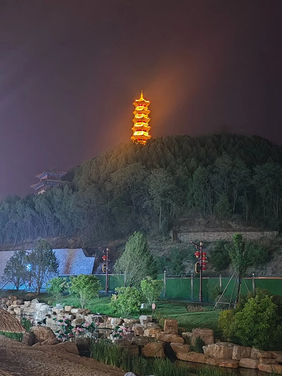 酒意渐渐上头,随意漫步,极目远眺,周边的山水风光尽收眼底,远处山峦起伏,山顶的佛塔灯光闪烁,与古老的城墙相互映衬,构成一幅绝美的画卷。