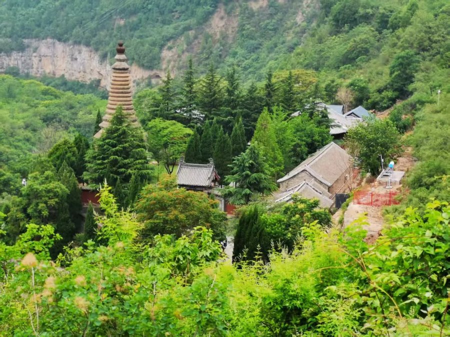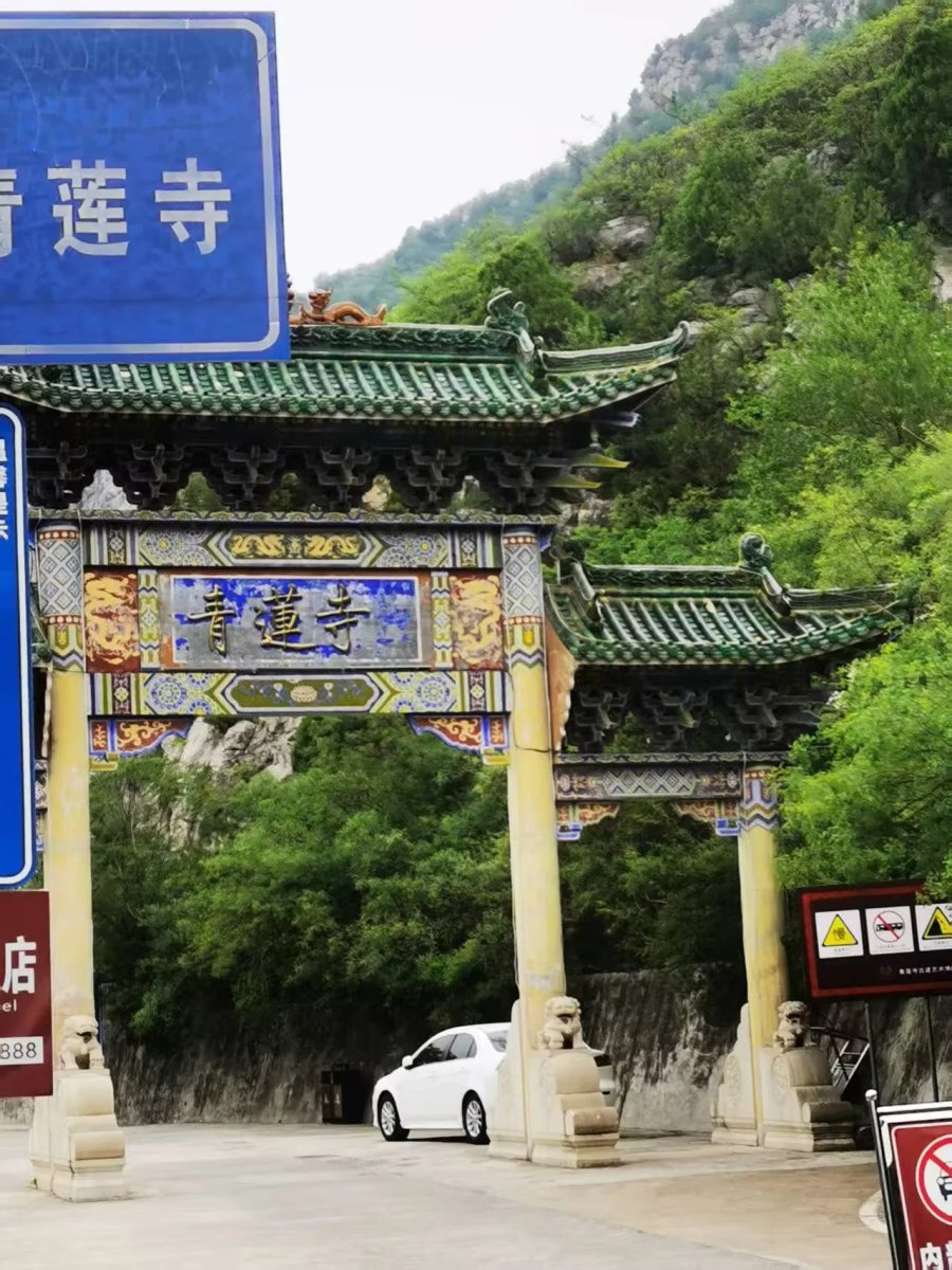 青莲寺位于珏山景区内,开车走不远右转就看到一个古老的牌坊。青莲寺坐卧于群山环抱之中,一条古称泽水今名丹河的山间滩河蜿蜒而过,我从远处看,烟云缭绕的珏山双峰屏围在古庙四周。