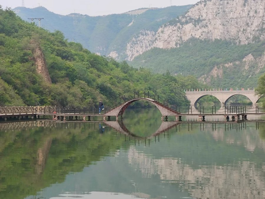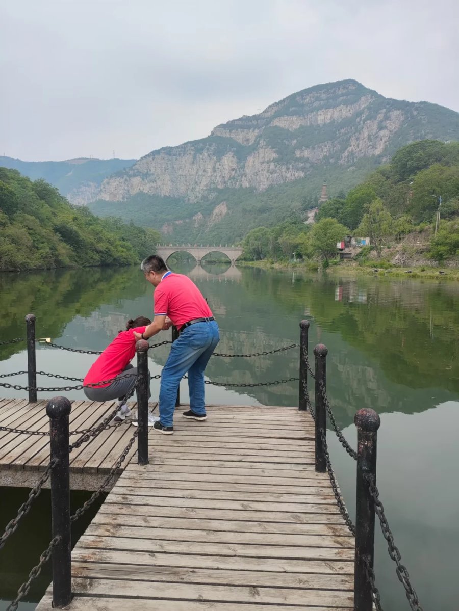 在太极湖的山水相依间,一座木桥横跨平静湖面,倒影成圆,与桥身相映成趣。青山如黛,绿意漫染,远处石桥静卧,我们本次出游的会计王美女漫步木桥,似融入这幅天然水墨。