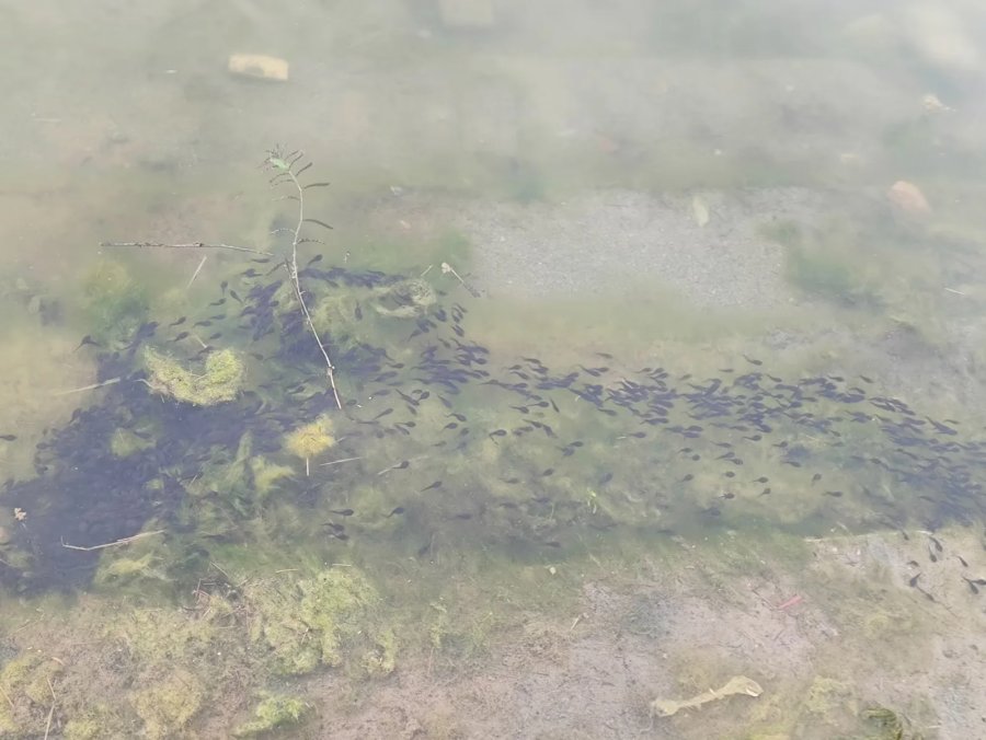 心情平复后,我也好奇地去看湖水。怪不得呢,原来如此,湖水里有大片,一群群蝌蚪在找妈妈。