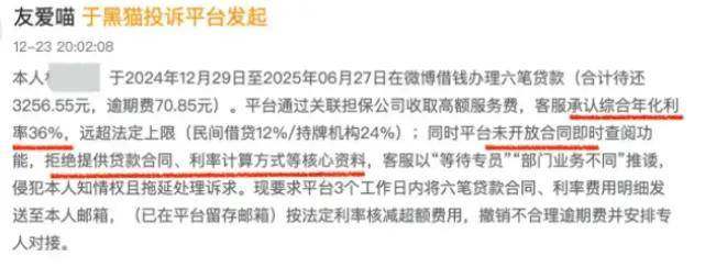 微博借钱宣传时声称综合年化成本(单利)7.2%起,然而实际借款中,不少用户发现自己的贷款综合年化利率高达36%。这一利率远超行业合规线,甚至超过了2025年监管新规要求的最高不得超过24%的年化红线。用户们在还款时才发现自己陷入了高利贷的陷阱,苦不堪言。
