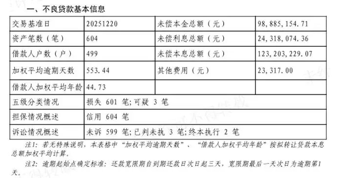 2026年2月,南京银行在银登中心挂牌了2026年第1期个人不良贷款(信用卡透支)资产包。该资产包包含604笔贷款、499户借款人,未偿本金9888.51万元、未偿利息2431.81万元,本息合计达1.23亿元;加权平均逾期天数553.44天,借款人加权平均年龄44.73岁,五级分类中损失类601笔、可疑类3笔,属于高风险个人不良资产。