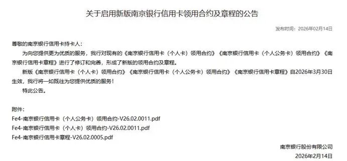 2026年2月,南京银行发布了一则公告,表示从3月30日起开始实行新的信用卡使用协议和章程。该行在公告中解释说此次修改是为了给持卡人提供更好的服务,是业务规则体系中常规性的优化和完善。