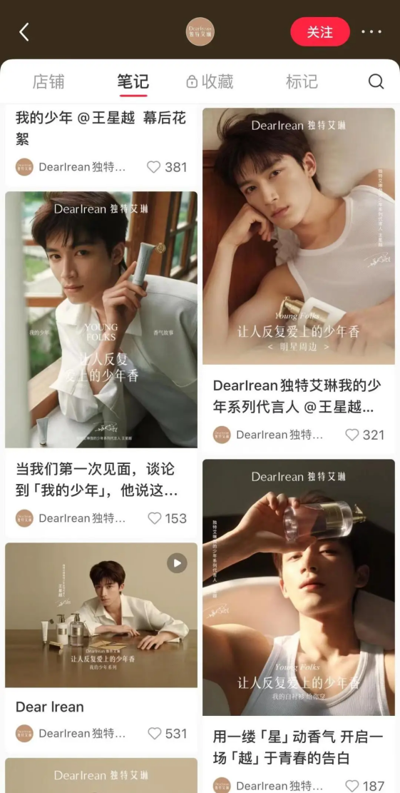 其中,“浮靡之水”与“我的少年”两款香型最为出圈。尤其是“我的少年”,凭借极具画面感的香调叙事,联动系列代言人王星越的形象,在宣传片中以午后阳光、木地板水渍、清浅呼吸等细节,调动感官、唤醒记忆,不仅让该香型深入人心,更成为独特艾琳品牌破圈的标志性范本。