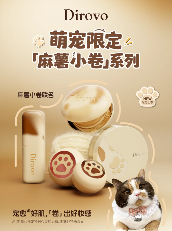 遇上联名活动,“卷包材”便会更进一步:与网红三花小猫麻薯小卷的联名中,蒂洛薇为参与活动的气垫、散粉、唇釉唇蜜都重新设计了以三花毛色为主题的新包装,并配备了猫爪粉扑。