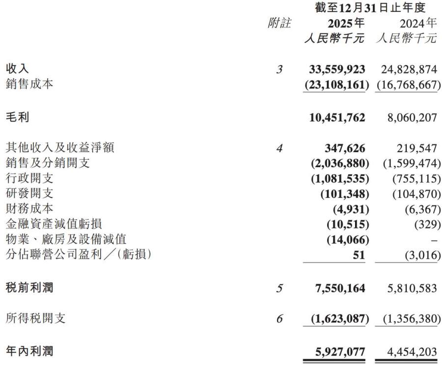 财报显示,蜜雪集团2025年的毛利约为104.52亿元,同比增长29.7%;净利润59.27亿元,同比增长27.0%。2025年,蜜雪集团的毛利率约为31.14%,与2024年的32.46%基本持平。