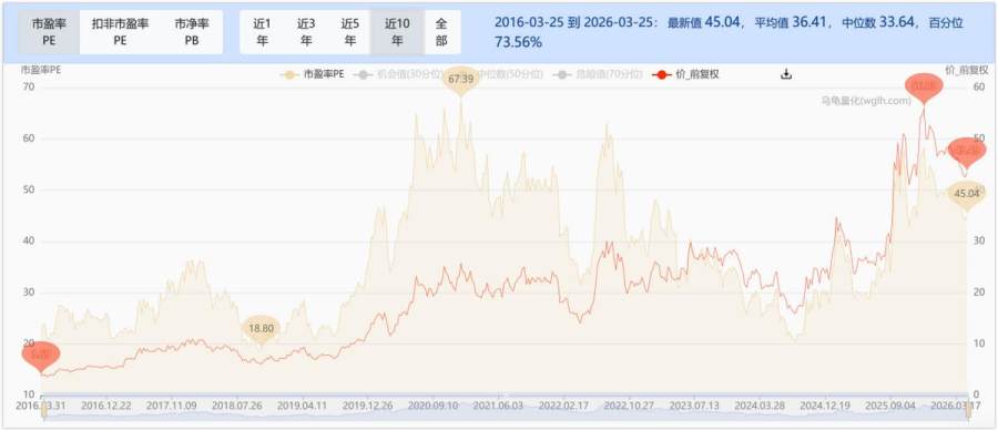 这种披露差异带来两层后果。第一,短期估值弹性会被压制。缺少量化指标,投资者难以给机器人业务单独建模,更多只能将其视作远期期权而非当期增长引擎,在估值上自然更谨慎。这也是三花智控估值一路向下的原因,PE从56掉到了45。