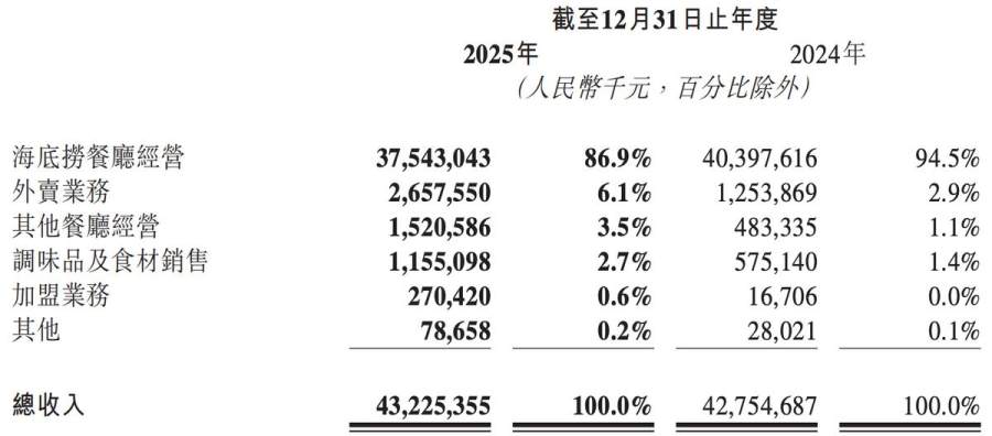 更值得关注的是,海底捞餐厅的系统销售额同比下滑3.7%,而这一指标才是衡量主品牌真实表现的核心数据。就收入而言,2025年,海底捞餐厅经营的收入约为375.43亿元,同比减少7.1%。