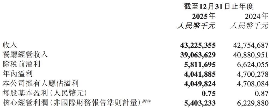 以此来看,海底捞的收入重新实现了增长,但增幅并不算高。2025年,海底捞的净利润约为40.42亿元,同比下降14.0%,2024年约为47.00亿元;核心经营利润54.03亿元,同比下降13.3%。