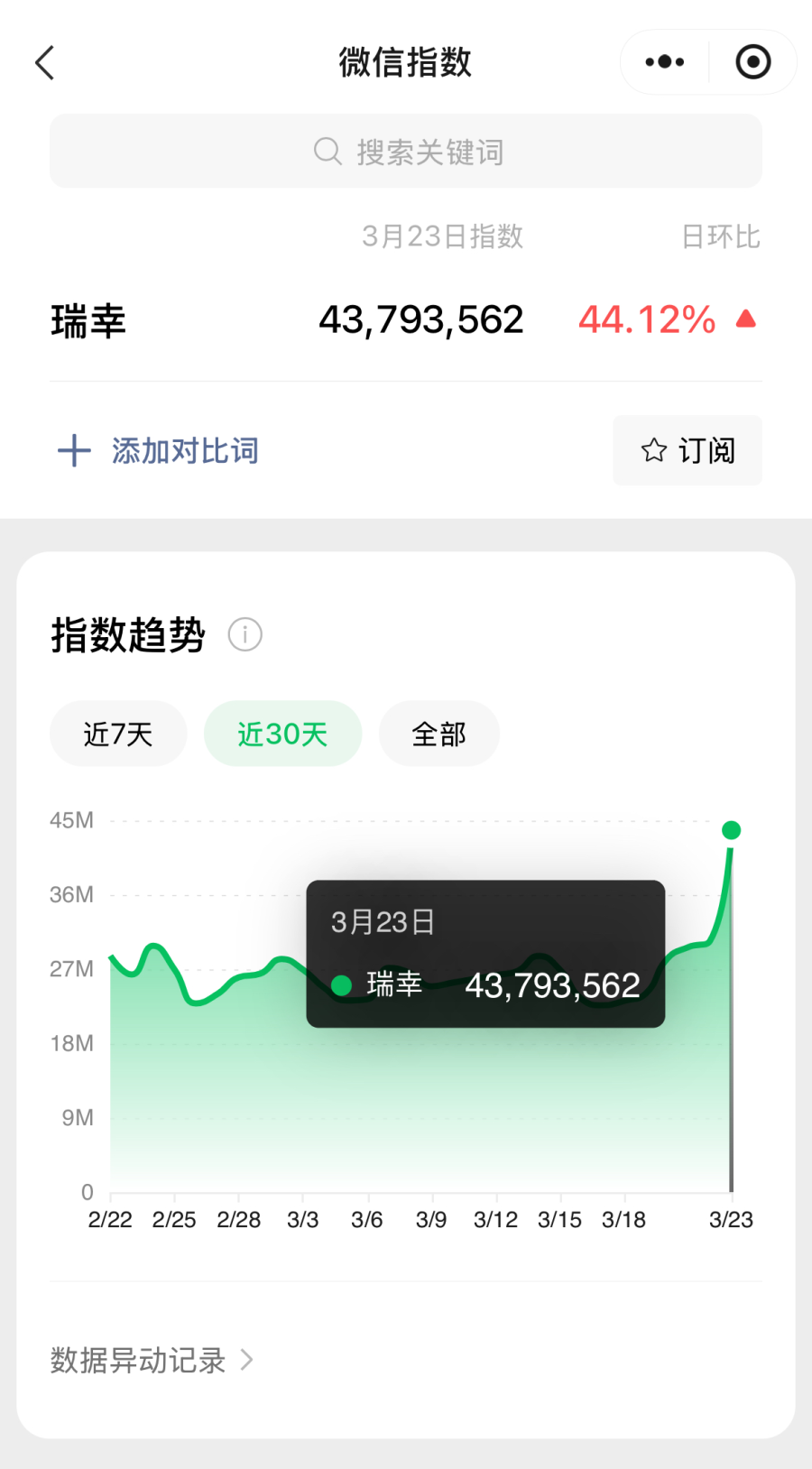 3月23日,瑞幸咖啡官宣罗永浩担任品牌“超大杯推荐官”,并发布了一支广告短片,引起广泛讨论与传播,微信指数显示,3月23日当天,瑞幸咖啡的微信峰值指数达到了近一个月的最高点,为4379.36万。