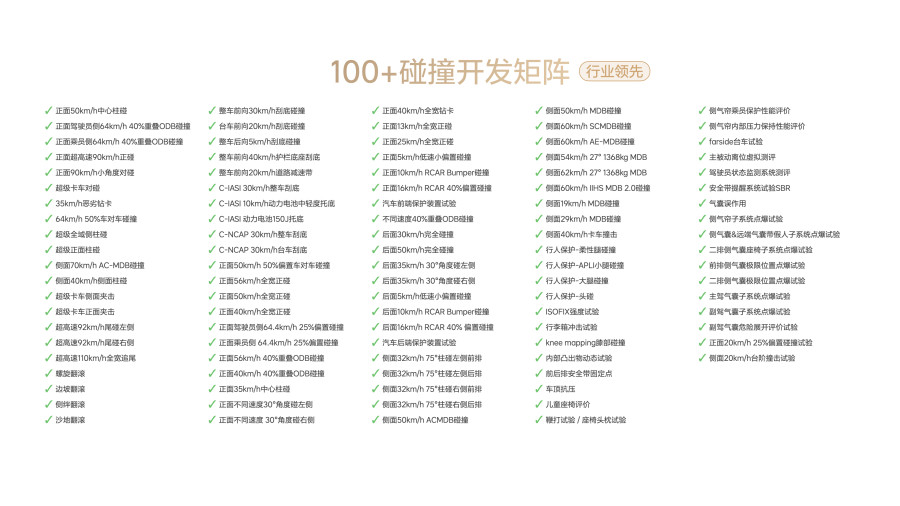 理想汽车始终坚持安全开发不应满足于“应试”,更需要充分考虑真实路况中的复杂场景。理想i6的碰撞开发矩阵全面覆盖超过100项整车级测试工况,超过行业平均水平的2倍以上,涵盖强制标准、三方测评、企业标准和超级安全四个层级。同时,理想汽车的研发标准考虑了95%以上真实用户出行场景,涵盖美标90公里小角度对碰、110公里超高速追尾、50公里正面中心柱碰、复杂多场景翻滚、卡车夹击等超级安全场景,最大限度保证用户出行安全。未来,理想汽车将持续以超越行业标准的自我要求,坚持自主研发与严苛验证,让每一位用户的每一次出行都更加安心。