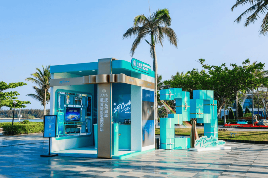 户外品牌快闪店以五粮液·一见倾心的天青色为基调,整体外观呈现为打开的礼盒形态,29个成员国的标志性建筑剪影融入“29”组合礼盒内,既呼应了博鳌亚洲论坛的国际化属性,又将五粮液的“和美”文化转化为可感知的场景体验,让其有了更具体、更生动的落脚点。