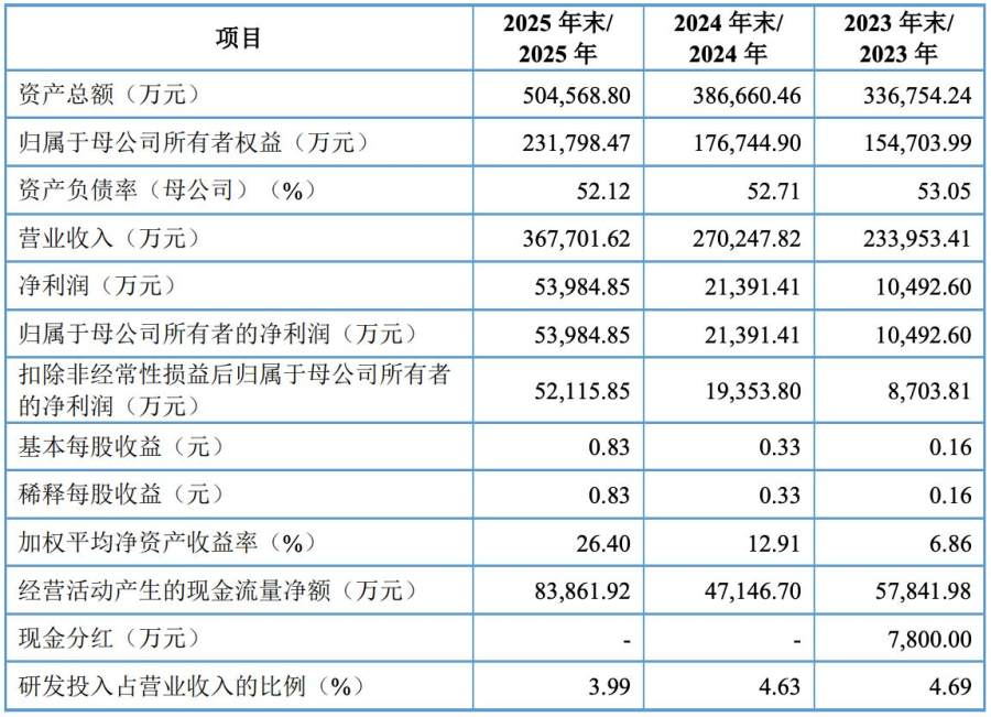 不难看出,红板科技的营收规模在2025年大幅增长。同时,该公司的盈利能力实现了跨越式提升。2023年,该公司的净利润同比下滑25.40%,但此后两年分别同比增长103.87%和152.37%,呈现"先抑后扬"的态势。