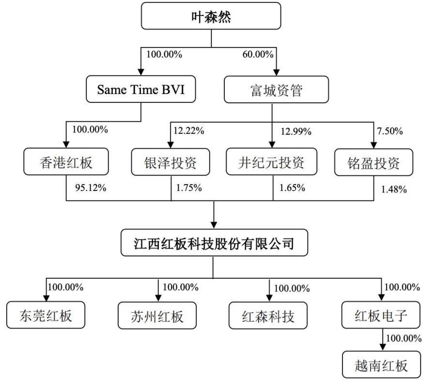 本次上市前,红板科技的实际控制人为叶森然。本次发行前,控股股东香港红板持股95.12%,Same Time BVI持有香港红板100%的股份,叶森然持有Same Time BVI的100%的股份。