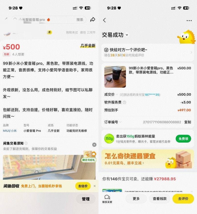 早上晨练打完篮球回家,看到有买家响应,安排了快递上门取件。这款在书架上待了近五年的Xiaomi Sound Pro音响就这样成交了。