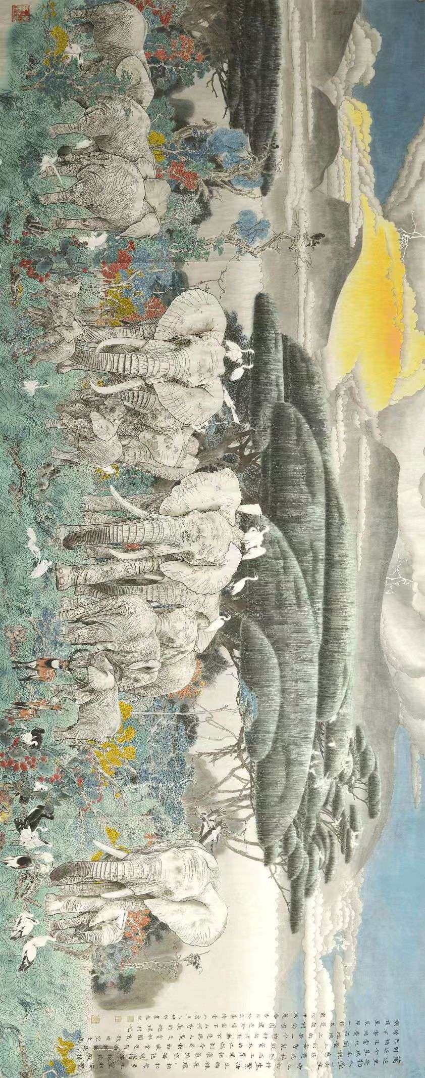 象群结队横推走,不畏强敌振族邦。