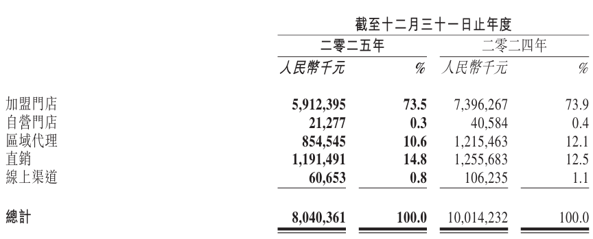 按分销渠道划分,2025年,百果园来自加盟门店的收入为59.12亿元,占总收入的73.5%,同比下滑20.06%。百果园的收入高度依赖加盟门店,但这一核心引擎正在失速。