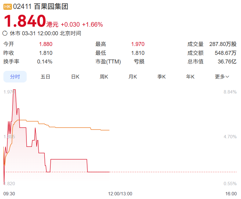 2023年1月16日,百果园登陆港交所,上市首日收盘的总市值高达94.74亿港元,截至3月31日中午休市,只剩36.76亿港元,跌去了61.2%;股价为1.84港元/股,较发行价5.6港元/股下跌67.14%。