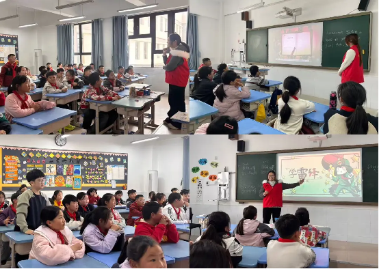 同日,志愿者走进新郑市桃园小学,开展“护眼健康、文明习惯、雷锋精神”主题志愿服务。志愿者化身“健康小老师”,通过 PPT 演示与趣味讲解,普及近视成因与科学用眼方法,带领孩子规范做眼保健操;用朗朗口诀教授“七步洗手法”,引导孩子养成卫生习惯。同时,指导孩子描绘健康小卫士与雷锋形象,重温雷锋事迹,引导孩子学习助人为乐品格,在心中种下“向雷锋学习”的种子,与孩子手拉手跳舞蹈,现场洋溢欢声笑语。