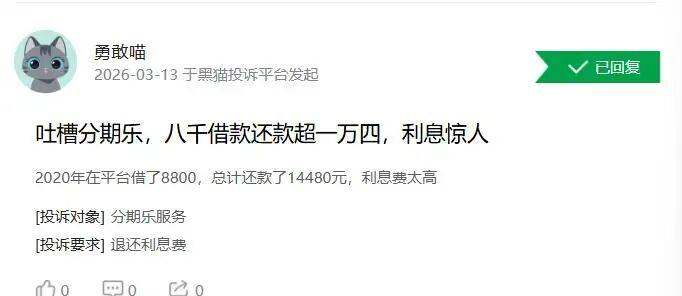 在黑猫投诉平台上,3月13日,一名消费者投诉称,在分期乐一共借了6.4万元, 基本上每一笔利率36%以上。还有 一名消费者称,在分期乐平台借款8800元,还款14480元。