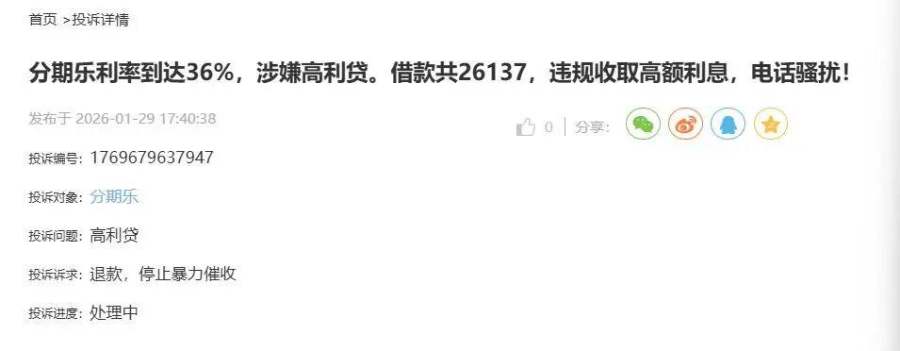 近年来,消费者对分期乐的投诉,主要包括对高利贷、收费不透明、诱导借款、收取会员费、强制购物、暴力催收等。