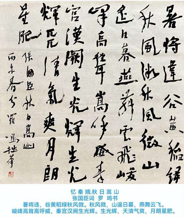 她鉴析道:上片开篇“暑将违,谷黄稻绿秋风微”,大处落笔,渲染初秋风光。寥寥七字,有形象、有色彩、有气息、有动感。“微”字洗练精当,一字灵动,便令满纸鲜活。“秋风微,山遥日暮,燕舞云飞”,日暮登临,群山在望,为全词蓄势。下片“峻峰高耸嵩呼威,秦宫汉阙生光辉”,诗人立于嵩山之巅,笔下意象飞扬,笔墨酣畅淋漓。松涛如海啸,殿宇映余晖,寓景于情,情景交融。结句“月朗星肥”,以“肥”字收束,大胆创新。“暑将违”“秋风微”“嵩呼威”“生光辉”“月朗星肥”,平水组词,炼字铸句,足见胆略。这是对嵩山文化的挚爱,对清明社会的向往,更是诗人豪放旷达性情的自然流露。
