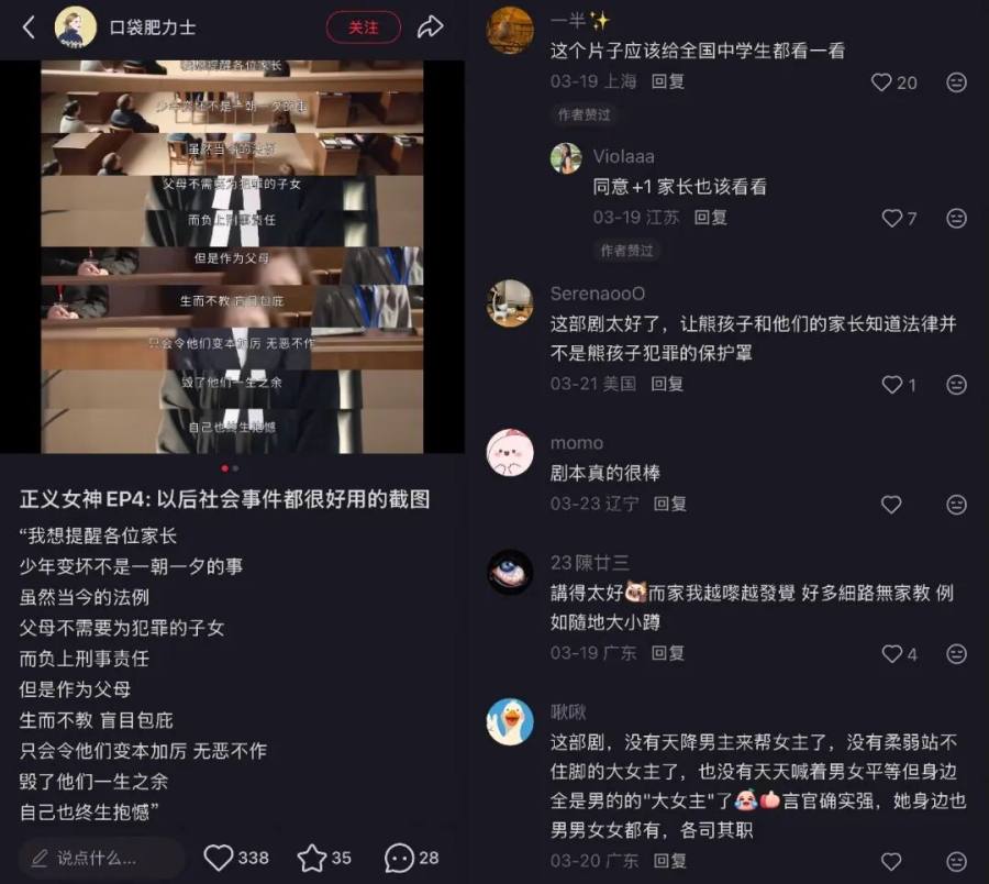 《正义女神》播出后,不少观众开始从具体的剧情细节、台词金句,延伸至对社会议题的深层思辨。