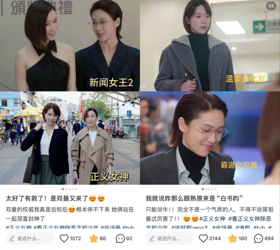 区别于过去造型风格趋同、演员个性模糊的“造星流水线”,新港剧注重为不同演员匹配更具反差感和个人特质的角色。例如蒋祖曼在《新闻女王2》中是霸气女总裁,又在《正义女神》里成为温柔感化官,极大释放了演员的多面潜能。