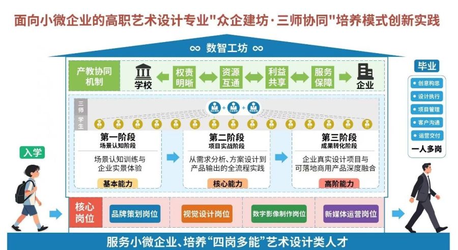 长期以来,高职艺术设计专业人才培养存在“大而全”与“小而精”的结构性矛盾。小微企业普遍面临设计岗位“招人难、留人难、用人贵”的困境,对人才的复合型技能与岗位适应度提出更高要求。传统教学中,学校单一主体培养出的学生往往难以胜任小微企业“一人多岗、一人多能”的实际需求。