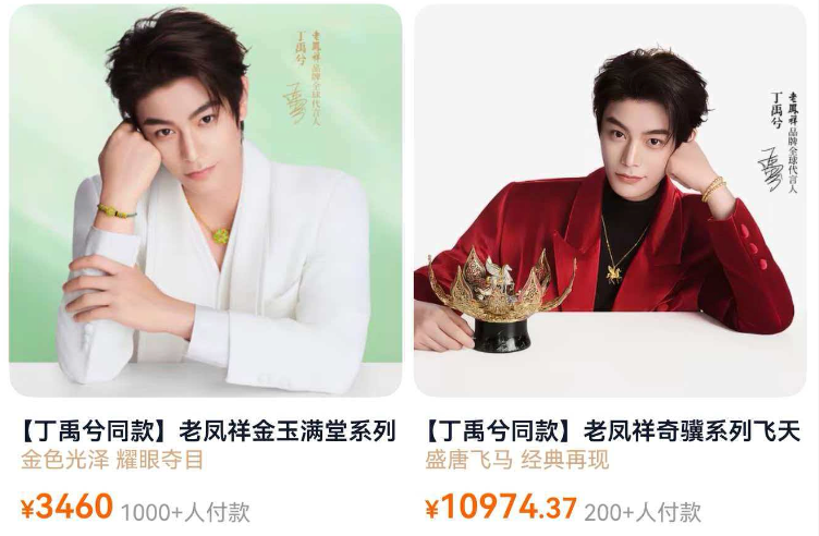 丁禹兮的粉丝以高净值年轻女性为核心,恰好与黄金轻奢及高端珠宝的目标客群高度重合。其粉丝购买力有目可睹,官宣当天,丁禹兮同款产品仅用了5分钟便售罄,双周销售额破6 亿。