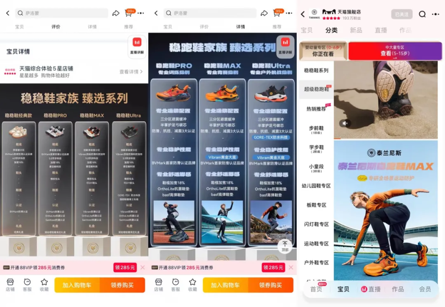 为了匹配其高端定位,泰兰尼斯在产品介绍里写满了科技和专业。继大爆品“稳稳鞋”之后,泰兰尼斯又在2025年8月推出了“稳跑鞋”。该主推系列堆上了各类运动科技,包括:Vibram止滑大底、半掌T700太空碳纤维、Ortholite抗菌鞋垫、双T支撑结构等。在公开宣传中,品牌将其称为“童鞋界的SUV”。