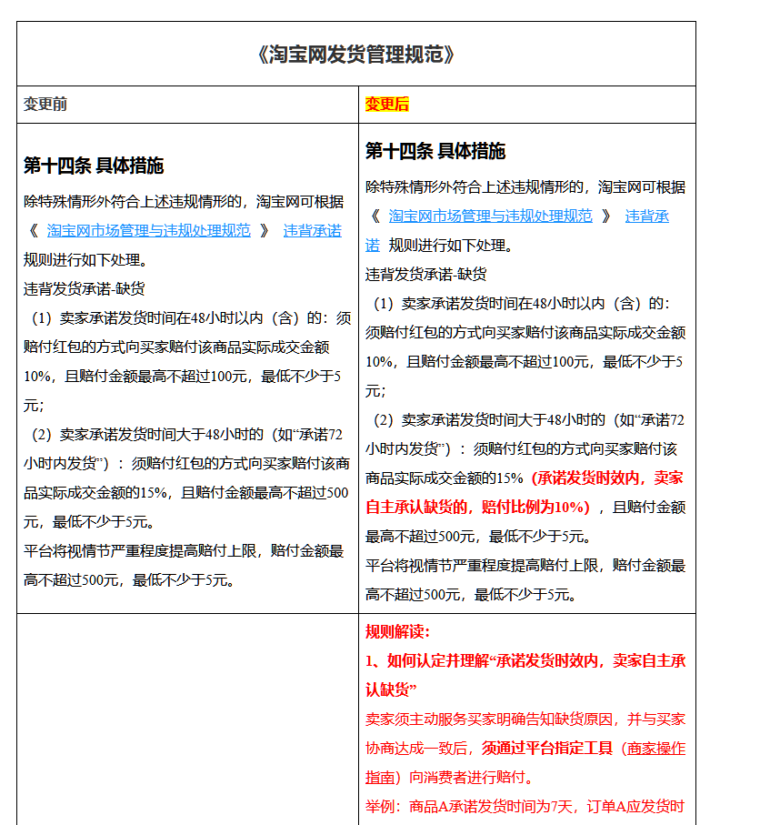 根据最新规则,在“缺货-卖家/商家自主承认缺货”的违规情形中,若卖家承诺发货时间大于48小时,且商家在承诺发货时效内主动服务消费者、明确告知缺货原因、与消费者协商一致并通过平台工具完成赔付的,其赔付比例将由原来的15%下调至10%。