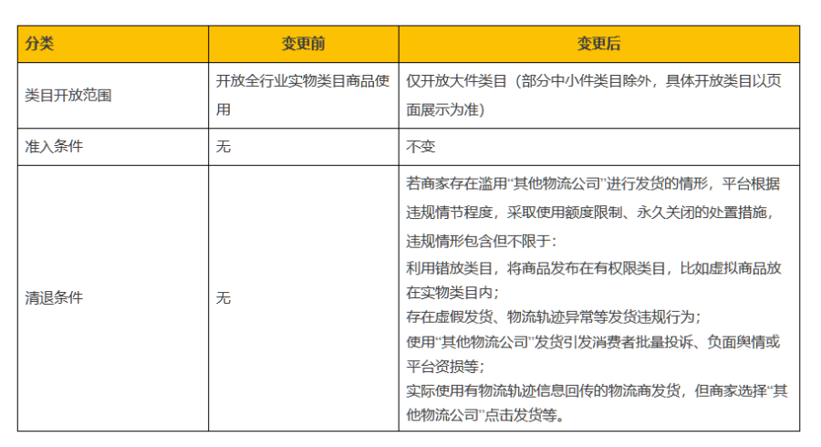 公告明确,后续平台将结合商品特性、物流能力等因素,综合评估后对特定类目开放其他物流公司的发货方式,具体开放类目以发货页面显示为准。