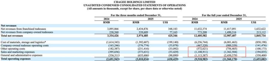 2025年全年,霸王茶姬的销售费用、管理费用和其他运营成本合计约45.6亿元,而2024年为27.9亿元。