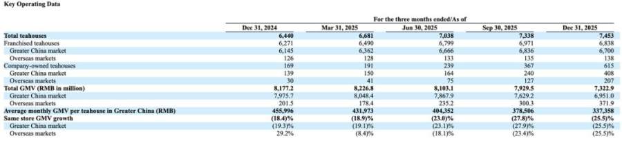 但客观地说,海外业务对整体业绩的拉动有限,占整体GMV的比重仅为5%左右。霸王茶姬的海外门店,现在也尚未形成健康的发展趋势,比如从同店GMV指标并不优秀。