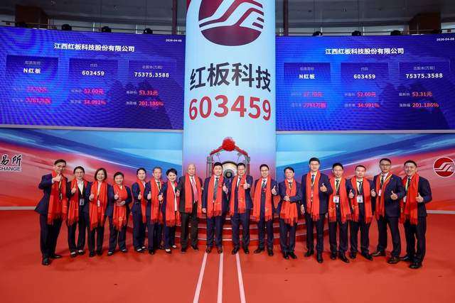 2026年4月8日,江西红板科技股份有限公司(股票简称:红板科技;股票代码:603459)在上海证券交易所主板成功上市。本次公司发行价格为17.70元/股,上市首日开盘价为52.00元,较发行价上涨193.79%。以开盘价计算,公司市值达370.85亿元。