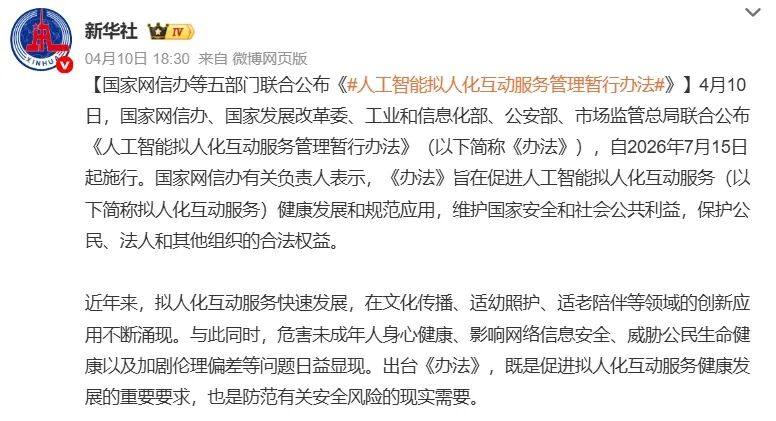 4月10日,五部门联合公布《人工智能拟人化互动服务管理暂行办法》,自2026年7月15日起施行,明确了安全评估和算法备案的相关要求,同时还对未成年人和老年人使用拟人化互动服务作出了相关规定,旨在促进行业健康发展和规范应用。