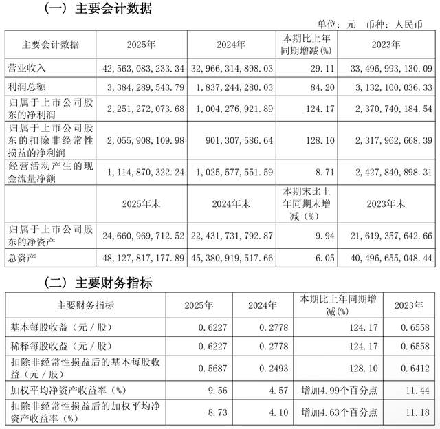 报告期内,北方稀土实现营业总收入425.63亿元,同比增长29.11%;归属于母公司所有者的净利润22.51亿元,同比大幅增长124.17%;基本每股收益0.6227元,增幅与净利润同步,达124.15%。