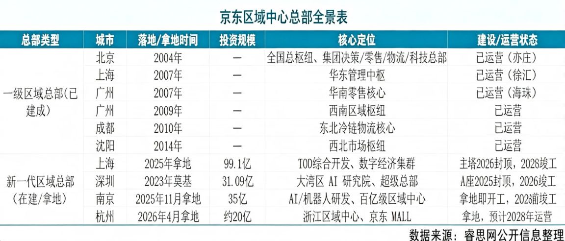 从上海99.1亿、深圳31.09亿、南京35亿到杭州20亿,京东在新一代总部上的累计投入已超185亿元。