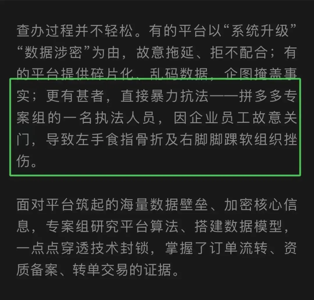 这篇题为《责任不能“转单”安全不容“造假”—— 市场监管总局重拳整治“幽灵外卖”乱象纪实》的文章中称,拼多多专案组的一名执法人员,因企业员工故意关门,导致其左手食指骨折及右脚脚踝软组织挫伤。