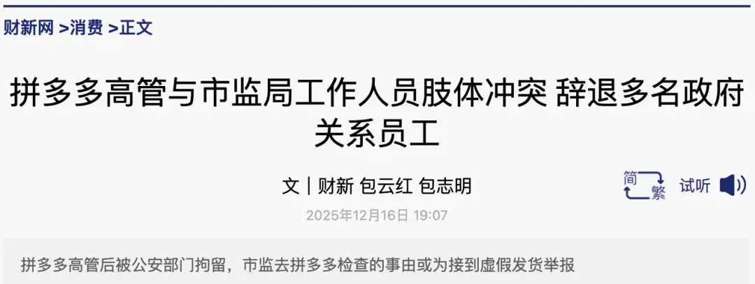 去年12月16日,财新网报道称,拼多多数名高管12月初和市监局人员在拼多多上海办公地点发生冲突后被拘留,文章引述接近拼多多人士称,因上述12月3日发生的打架事件,拼多多的政府关系部门多名员工被辞退。
