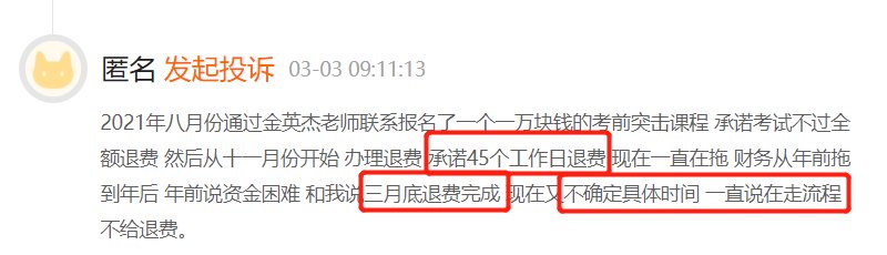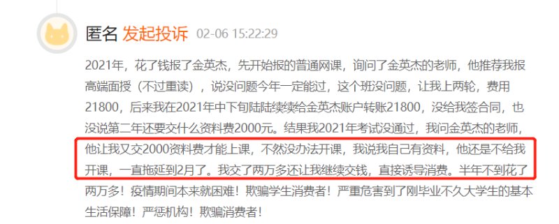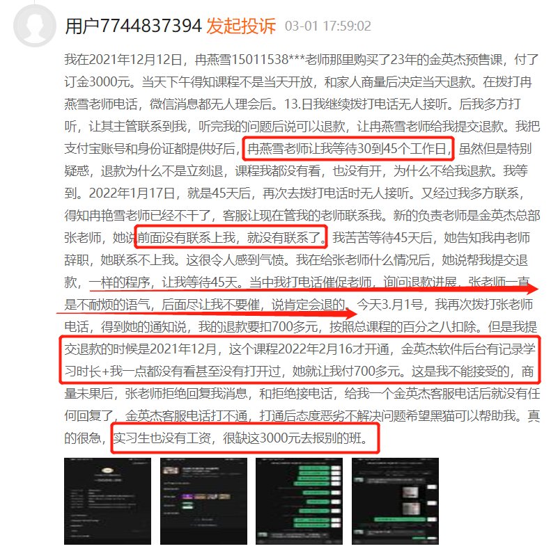 有网友在黑猫投诉上称,2021年8月曾在金英杰报名价值10000元的考前突击课程,公司承诺考试不过全额退费。但从11月申请退费开始,金英杰一直在拖延,以各种借口敷衍他。