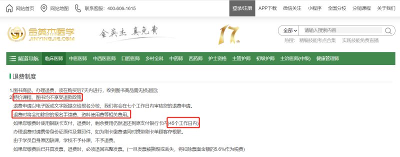 蓝鲸教育发现,在金英杰医学官网上,专门设置了“退款制度”一栏,提到“退费时将扣除报名手续费、资料使用费等相关费用”。然而,对于扣费比例、扣除条件等,均无具体说明,在实际操作中容易出现机构随意解释的情况。